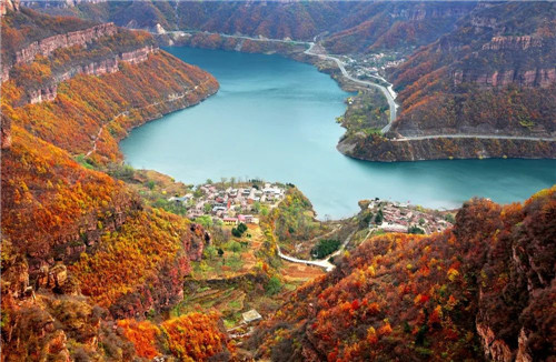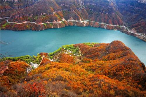 太行平湖又名南谷洞水庫,是太行大峽谷河流“露水河”的攔河蓄水工程。站在崖邊,平湖靜臥在群山巍峨之中,湖面倒影卓卓,仿佛步入了一幅巍峨壯麗的畫卷中,在明凈湛藍(lán)的天空下,厚重的山脈在滿山紅葉的搖曳中,展現(xiàn)出絕美的風(fēng)骨,一切都是那么的唯美和自然。