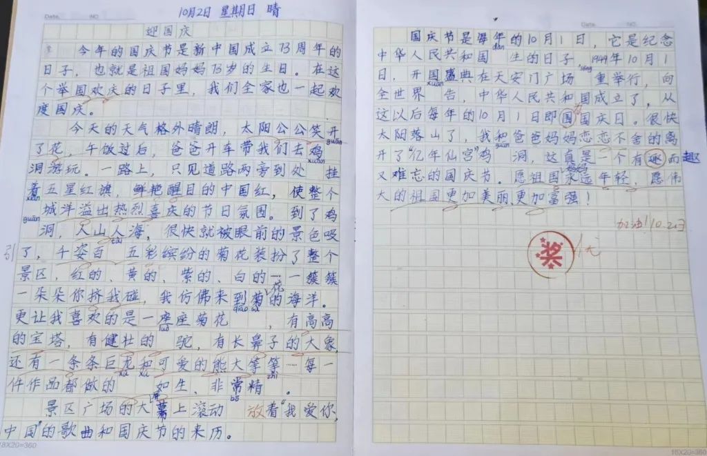 注:上圖為二年級小朋友游覽雞冠洞后有感書寫,被評為優(yōu)秀作文。