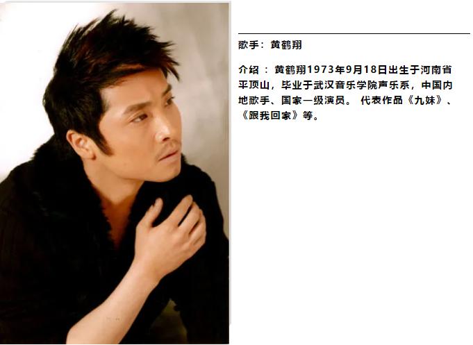 歌手:黃鶴翔介紹 :黃鶴翔1973年9月18日出生于河南省平頂山,畢業(yè)于武漢音樂學(xué)院聲樂系,中國內(nèi)地歌手、國家一級演員。 代表作品《九妹》、《跟我回家》等。