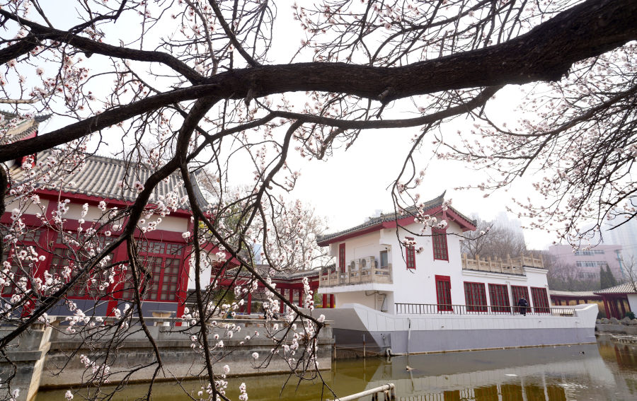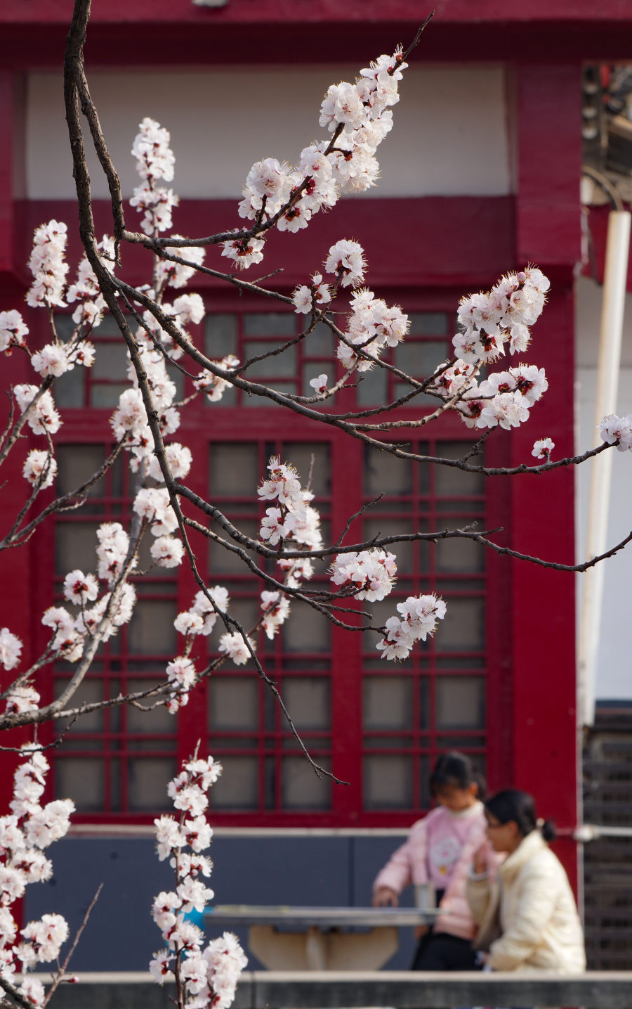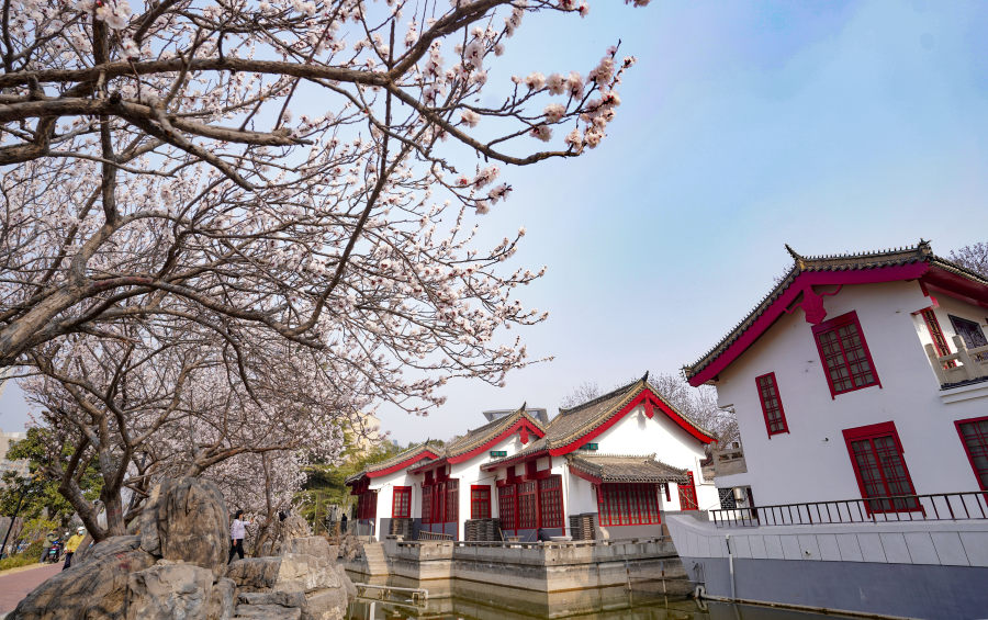 3月14日,鄭州市區(qū)嵩山路西側(cè)金水河公園隋河宋肆旁景點(diǎn)的杏花迎著春風(fēng)怒放,與仿古建筑相映相襯,美麗無(wú)比。這是鄭州市區(qū)“最美”的杏花觀賞地,吸引了很多市民賞花、拍攝。