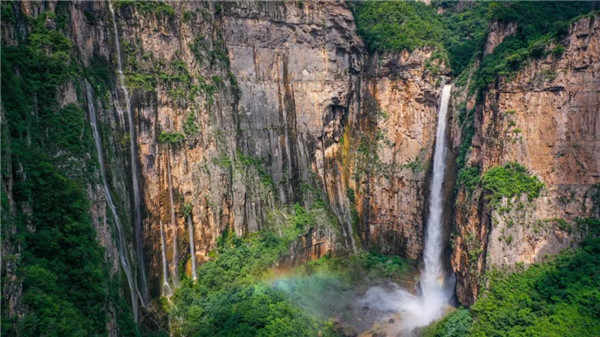 山雄水秀,峰高瀑急,青山四合,如同仙閣,單級落差314米的“云臺天瀑”雄冠華夏,它上吻藍天,下蹈石砰,猶如擎天玉柱,凌空飄落,攜雨撫風,宛如透明玉帶。
