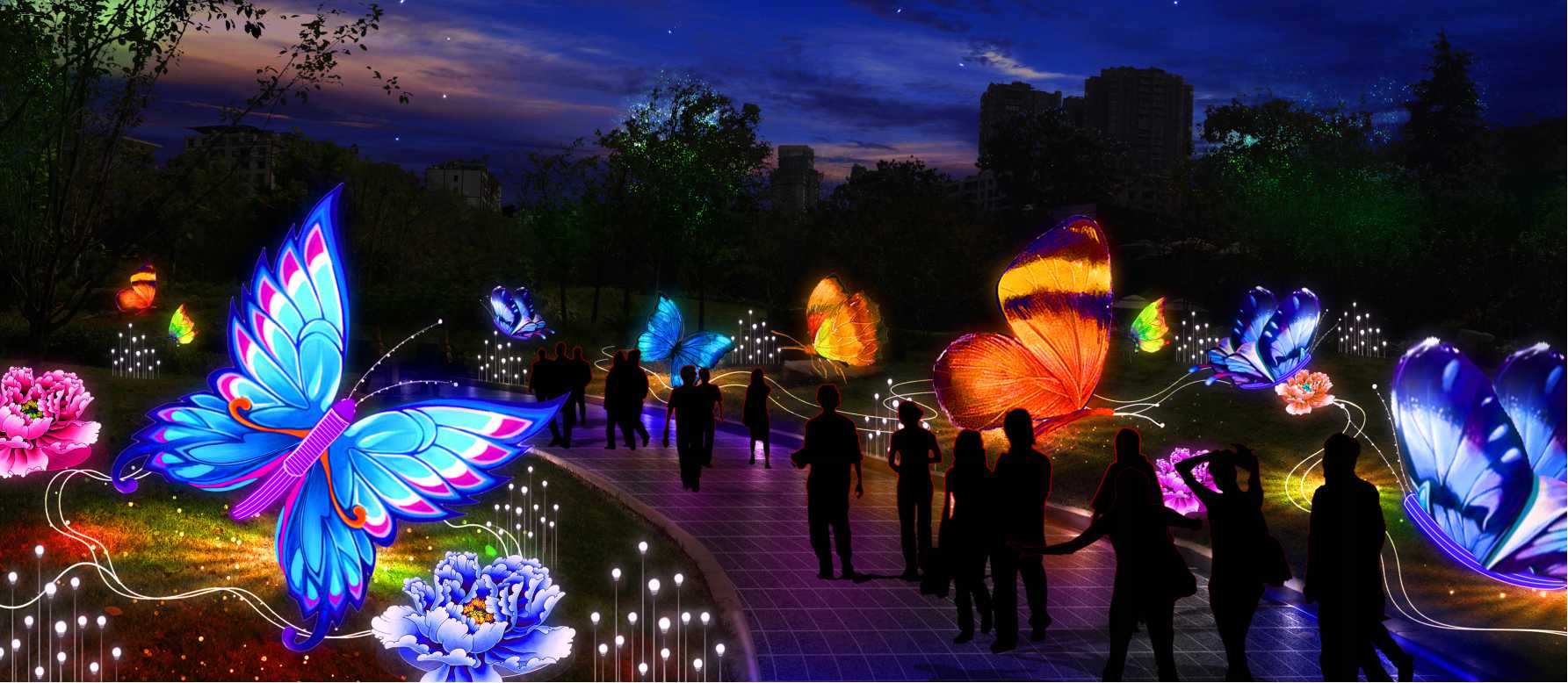 12只直徑1.5米的大蝴蝶也將飛入園區(qū),以“蝶戀花”千嬌百媚的姿態(tài),與游客互動(dòng),詮釋美好與愛情。