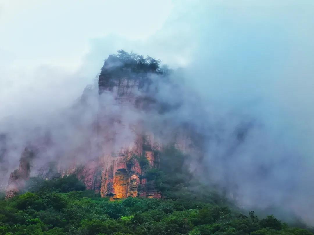 遙望遠(yuǎn)處蒼翠的群山,遠(yuǎn)遠(yuǎn)地看見一縷亮光,劃破濃濃的霧氣,照亮了丹山一隅,仿佛要升起一輪金色的太陽。