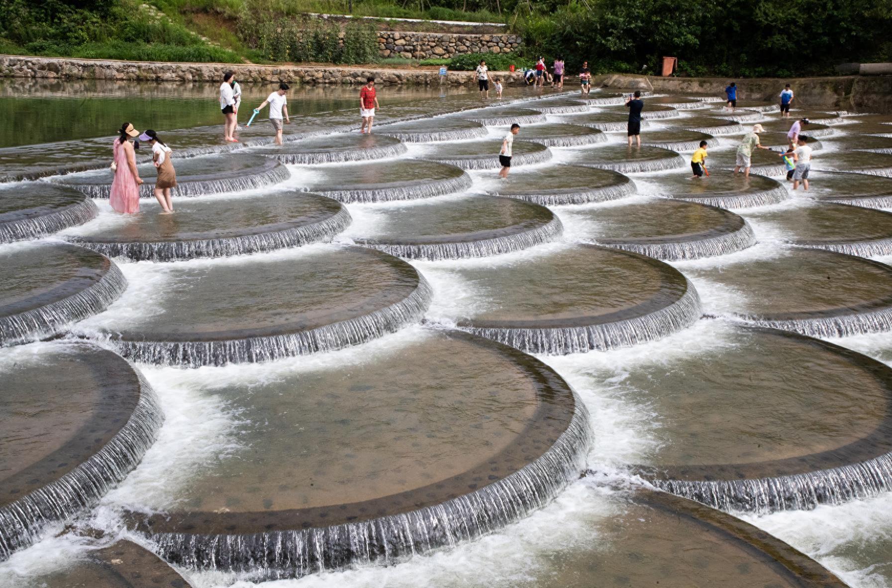 7月2日,擁有中國美麗休閑鄉(xiāng)村、河南唯一全國“零碳標(biāo)準(zhǔn)試點”村等諸多光環(huán)的商城縣伏山鄉(xiāng)里羅城村,雨后乍晴,美若仙境,天藍(lán)云白、山清水秀,奇峰飛瀑窗前掛、清溪奔涌繞田園,按捺不住的孩子們,早已撲向千工堰、魚鱗壩、大水車等親水平臺,與夏日清涼擁個滿懷。