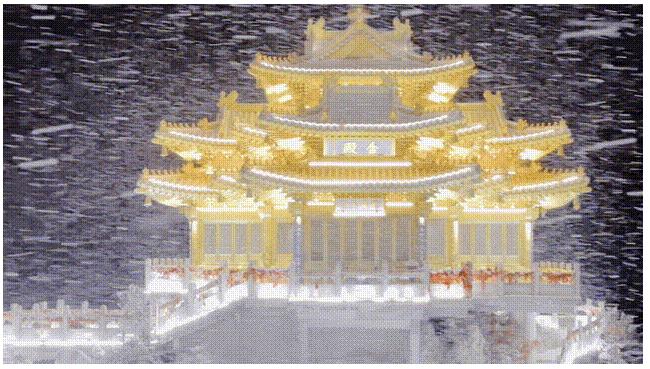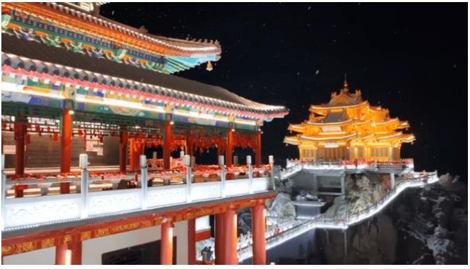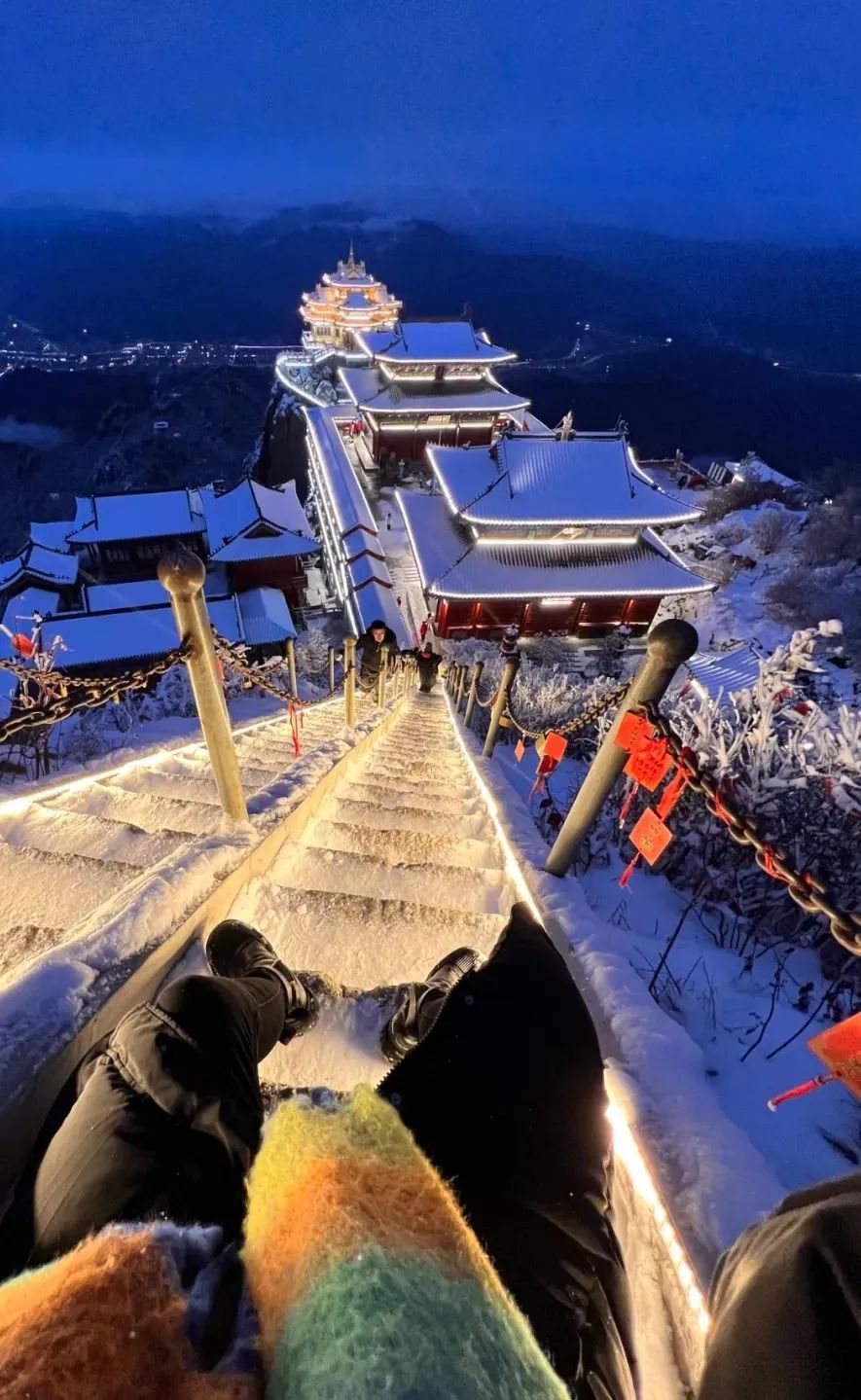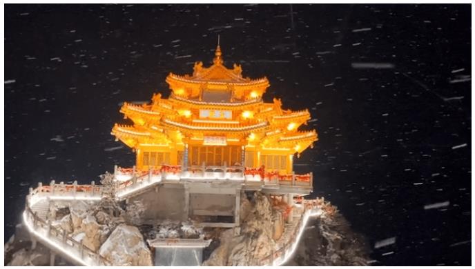 華燈初上,飛雪與光影交相輝映,把老君山帶進(jìn)了童話世界。