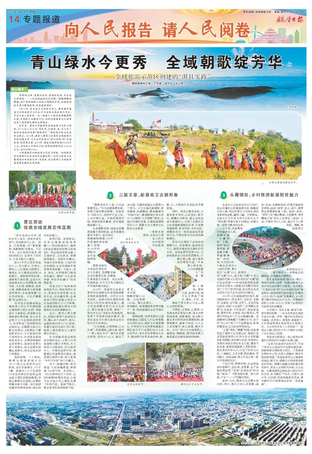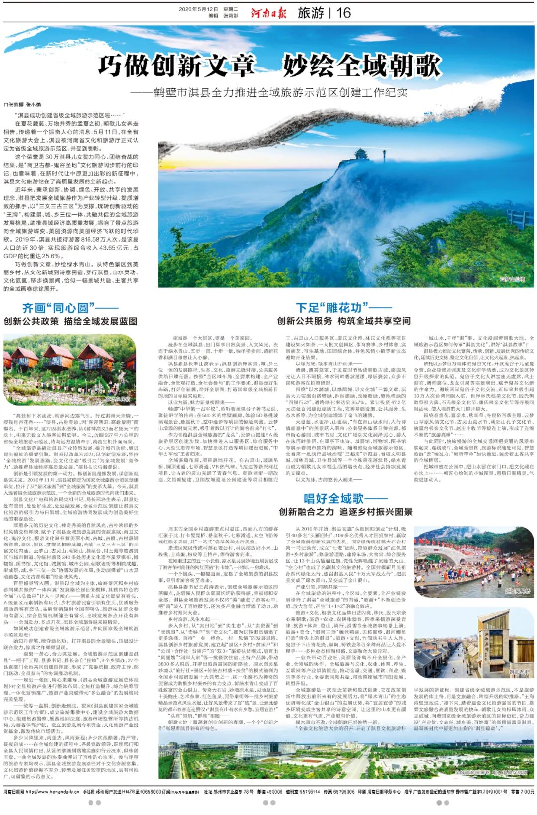 5月12日,河南日報以《巧做創(chuàng)新文章 妙繪全域朝歌》為題,專題報道了淇縣全域旅游示范區(qū)在創(chuàng)建工作中的亮點和先進經(jīng)驗做法;鶴壁日報以《青山綠水今更秀 全域朝歌綻芳華》為題,對淇縣全域旅游創(chuàng)建的“朝歌模式”進行了專題報道。河南日報客戶端、河南旅游手機報、河南旅游資訊網(wǎng)、今日頭條、騰訊網(wǎng)、大豫網(wǎng)、鶴壁新聞網(wǎng)等眾多網(wǎng)絡媒體也紛紛聚焦淇縣,進行全文轉載,淇縣全域旅游引起社會各界廣泛關注,好評如潮。