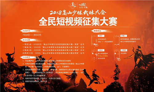 當(dāng)流行時(shí)尚遇上傳統(tǒng)文化,當(dāng)即興舞蹈邂逅傳奇功夫,會(huì)碰撞出怎樣的火花?嵩山少林全民短視頻征集大賽,作為2018嵩山少林武林大會(huì)的第二期主題活動(dòng),邀請(qǐng)全球游客用當(dāng)下最流行的短視頻創(chuàng)作形式,彰顯個(gè)性真我之風(fēng)采,展現(xiàn)嵩山少林之奧義,講述功夫文化之厚重,傳遞中華文明之流遠(yuǎn)。大賽作品征集時(shí)間為2018年7月14日至8月22日,跨越整個(gè)暑期,特設(shè)萬(wàn)元大獎(jiǎng),獎(jiǎng)勵(lì)優(yōu)勝者。