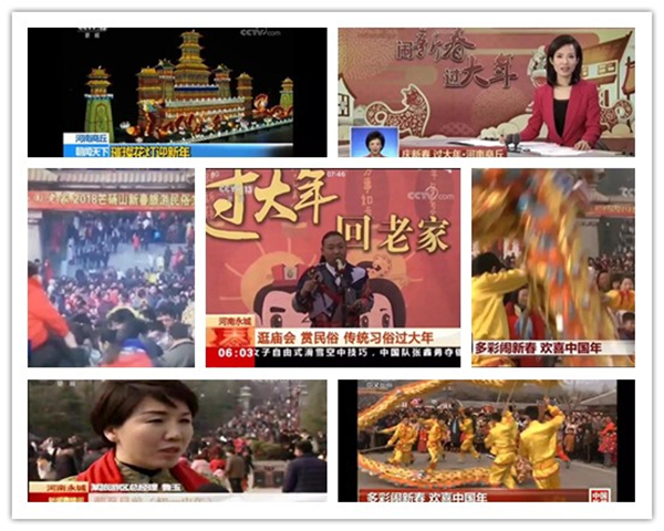 春節(jié)黃金周期間芒碭山旅游區(qū)全力打造的2018芒碭山新春旅游民俗文化節(jié)“到芒碭山過漢風(fēng)年”系列民俗活動(dòng),尤其是新春燈會(huì)、鋼花火龍等受到央視青睞,CCTV—1綜合頻道、CCTV—13新聞?lì)l道和CCTV—4國際頻道等欄目相繼報(bào)道,《朝聞天下》、《 共同關(guān)注》、《新聞聯(lián)播》、《新聞直播間》、《中國新聞》等直播和重播16次。