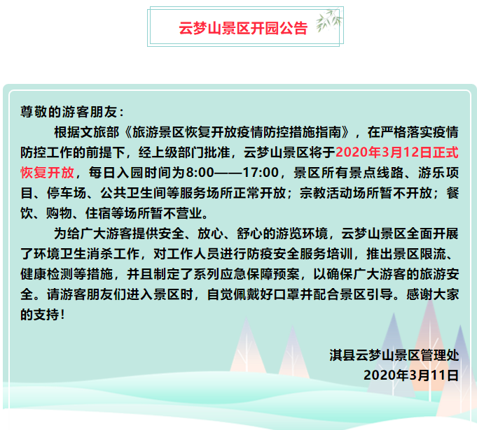 3、疫情管控期間,云夢山景區(qū)餐飲、住宿場所暫不營業(yè),游客需自帶食品,并在行前規(guī)劃好路線,避免夜間滯留景區(qū)。游覽過程中產(chǎn)生的垃圾請自覺投入垃圾箱,保持景區(qū)環(huán)境衛(wèi)生。
