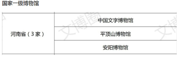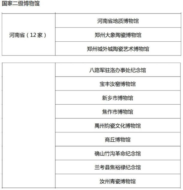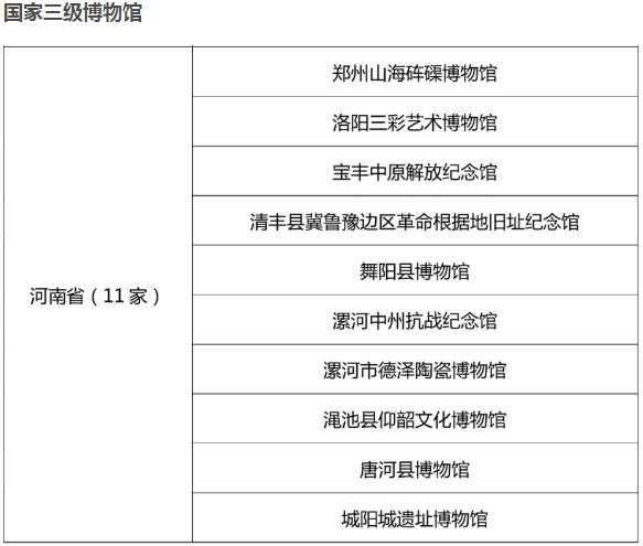 其中,中國(guó)文字博物館、平頂山博物館、安陽(yáng)博物館3家博物館定級(jí)為一級(jí)博物館;河南省地質(zhì)博物館、鄭州大象陶瓷博物館、新鄉(xiāng)市博物館等12家博物館定級(jí)為二級(jí)博物館;鄭州山海硨磲博物館、洛陽(yáng)三彩藝術(shù)博物館、澠池仰韶文化博物館等11家博物館定級(jí)為三級(jí)博物館。