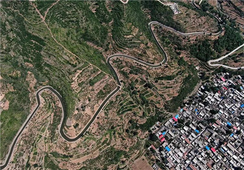紅旗渠總干渠從一座村莊旁繞過(2019年7月5日無人機(jī)拍攝)。新華社記者 李安 攝