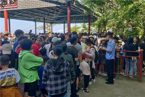 巡特警抽調(diào)精干力量到老君山,他們?cè)谌肆髅芗瘏^(qū)域堅(jiān)守執(zhí)勤,為游客保駕護(hù)航。