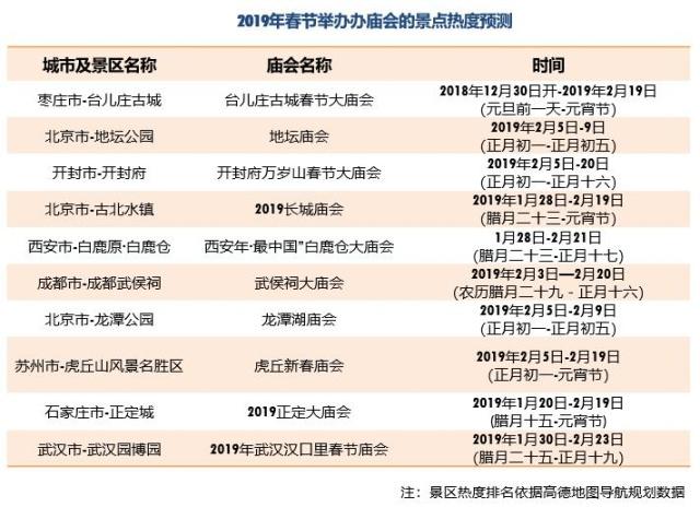 《2019年平安春運安全出行指南》預(yù)測出了2019年春節(jié)期間國內(nèi)舉辦廟會的十大熱門景區(qū),其中棗莊市臺兒莊城-臺兒莊古城春節(jié)大廟會,北京市地壇公園-地壇廟會,開封萬歲山春節(jié)大廟會位列前三位。