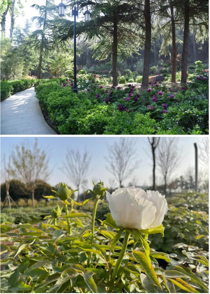 夷園內(nèi)種植牡丹400余株,分別是洛陽紅,首案紅,黑海撒金,迎日紅,景玉,白雪塔,豆綠,青龍臥墨池,珊瑚臺,彩繪,雪映桃花,銀紅巧對,銀粉金鱗。