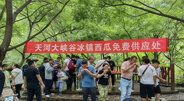7月2日、3日,素有“中原小西藏”之稱的清涼勝境天河大峽谷內(nèi),冰鎮(zhèn)西瓜免費(fèi)供應(yīng),讓眾多游客倍感驚喜和暖心。