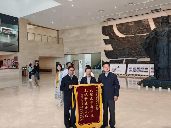中國八大古都教育系統(tǒng)關(guān)工委工作協(xié)會贈鄭州商代都城遺址博物院“天地之中鄭州城 春泥護(hù)花花兒紅”錦旗。