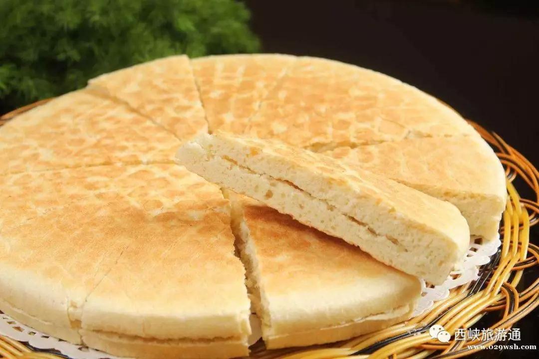 這種花紋遍布芝麻焦香酥脆外硬內(nèi)軟的鍋盔饃,像一個(gè)倒扣的鍋蓋。邊薄心厚,表皮金黃,用刀切開(kāi),狀如板油,聞著香甜,吃起來(lái)酥脆可口,回味無(wú)窮,耐饑、耐貯、攜帶方便,是西坪的特色美食之一。