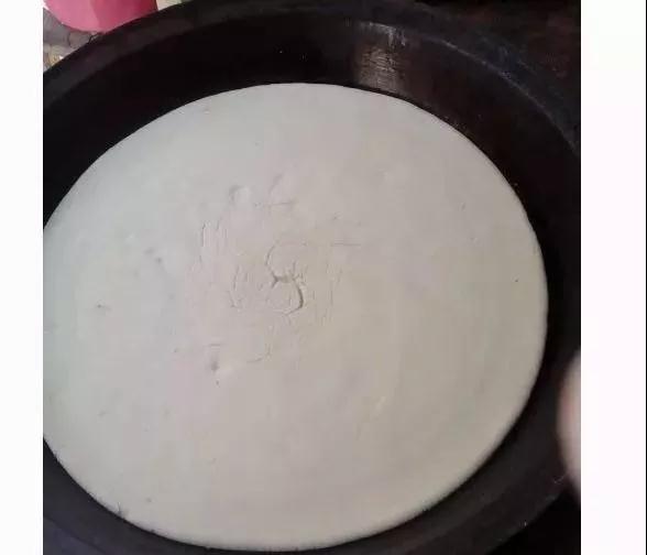 將揉好的面團,壓成和鍋的面積大致相同,厚2CM的面餅,置于鍋中。