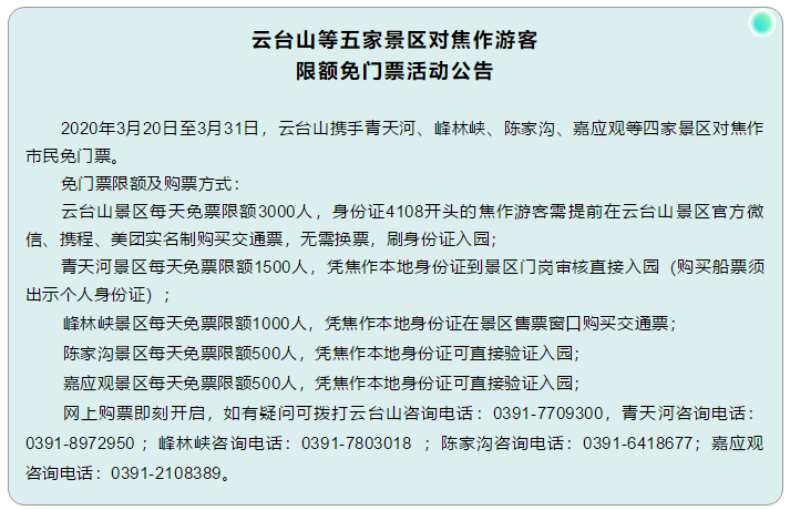 好消息來了!2020年3月20日至3月31日,云臺山攜手青天河、峰林峽、陳家溝、嘉應觀等4家景區(qū)宣布對焦作市民免門票,記住是有限額的哦!