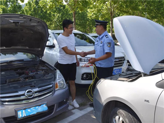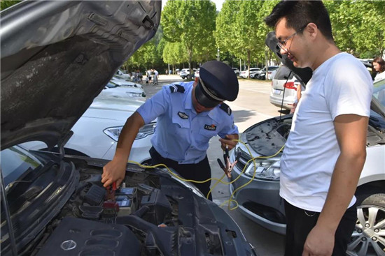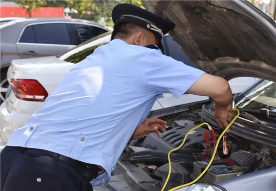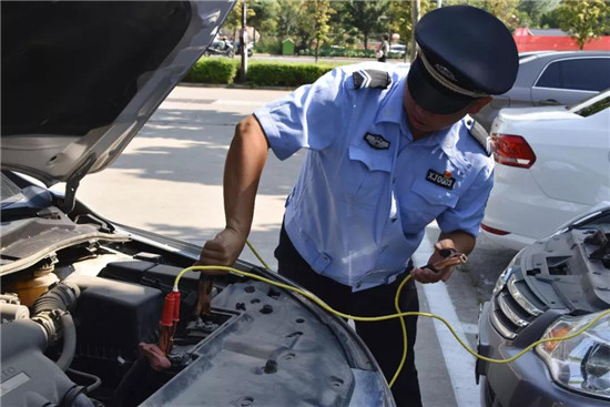 原來是來自鄭州的高先生,將自己的車停放在景區(qū)停車場內(nèi)四天,準(zhǔn)備離開時,發(fā)現(xiàn)怎么也打不著火了。正在為難之時,被景區(qū)保衛(wèi)部巡邏人員發(fā)現(xiàn),了解情況后,判斷高先生的車可能因長時間停放,導(dǎo)致電瓶虧電而無法打火啟動。