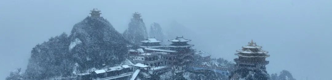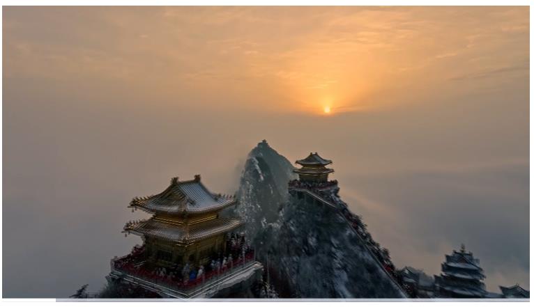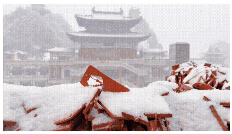 而雪后陰天的老君山因為光線原因,看到和拍攝后的畫面,顏色往往偏冷偏灰白,古風、建筑在這樣的天氣下最有意境,天色和建筑環(huán)境同一色調(diào),畫面就會協(xié)調(diào),韻味就出來了。