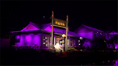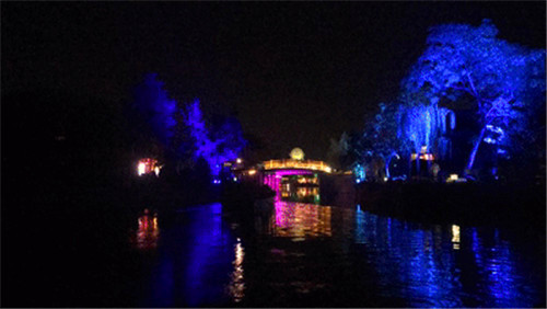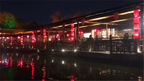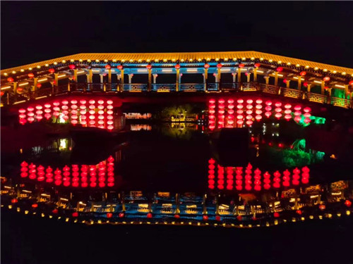 隨著船工的一聲:“點燈,開船咯!”聽雨橋上千百盞紅燈籠亮起來,隨著音樂閃動。游船駛出雙亭橋碼頭,穿過燈籠簾帳,在兩岸流漓燈影中,緩緩向前。