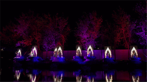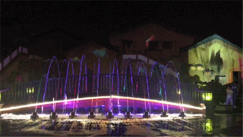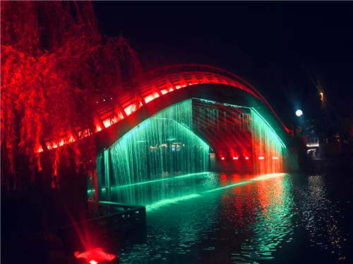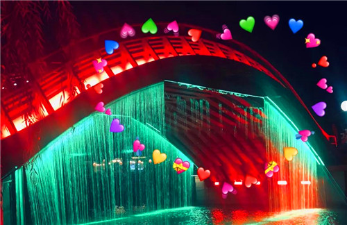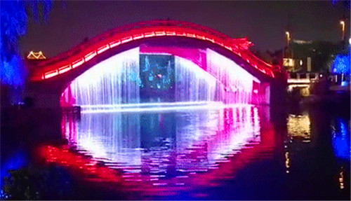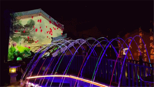 繼續(xù)前行,虹橋水幕飛瀉而下。水幕投影上開始出現(xiàn)各種祥云。明月的光輝逐漸灑滿整個水幕。在燈光的配合之下,整個虹橋區(qū)域一片絢麗夢幻的景象。