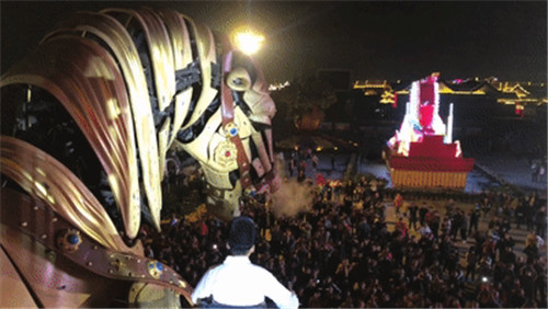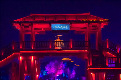 游船駛過吊索橋之后,岸邊的燈光亮起,樂聲陣陣,舞姿翩翩,古老的繁塔瞬間春意盎然。