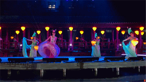前方一片荷塘月色,一群美麗的女子魚貫而出,在柳蔭下、荷花邊,隨風(fēng)跳起輕柔的舞蹈,仙子們的舞蹈與花兒、柳枝仿佛在爭春爭俏一般。