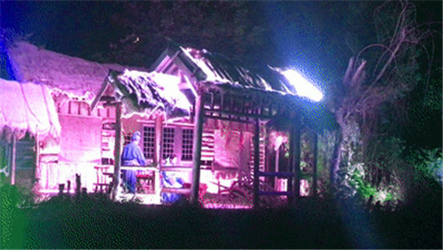 游船向前行駛,在岸邊茅草屋的小院里,一對夫婦正在納涼喝茶,男子看書,女子在給可愛的孩子哼唱小曲,可真是樸實恬靜的鄉(xiāng)間生活啊