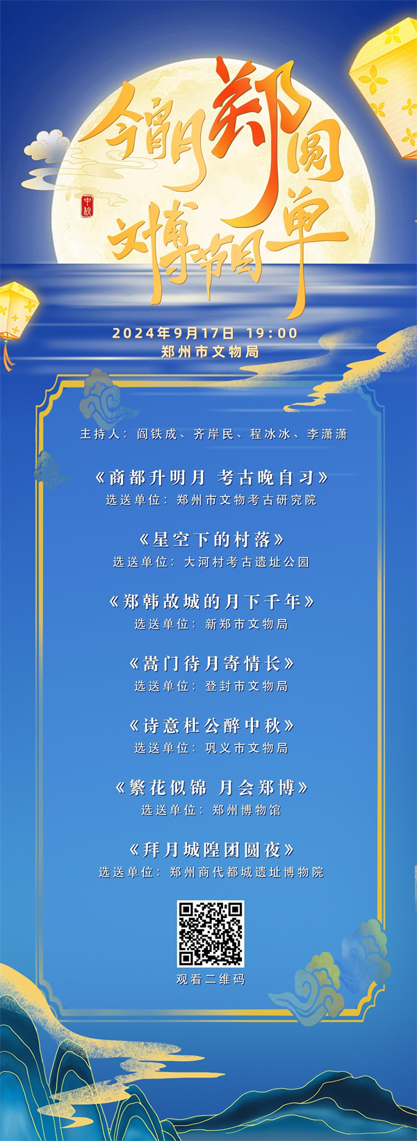 9月17日19:00,“今宵月‘鄭’圓”鄭州市文博特別節(jié)目,將正式上線。四位專家、學(xué)者和媒體達(dá)人將分別從城市考古課堂中甲骨文的“月”,到6000多年前大河村考古遺址公園的彩陶“月亮紋”;從 2700年前的鄭韓故城,到“嵩門待月”的盛景;從“月是故鄉(xiāng)明”詩句中的杜甫故里,到鄭州城隍廟的拜月儀式、鄭州博物館中秋奇妙夜......讓您在中秋之夜,共度傳統(tǒng)節(jié)日,與歷史對話,感受跨越時空的情感共鳴。