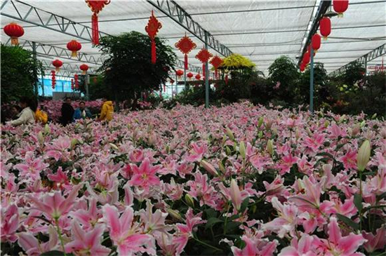 4000平方米智能溫室內(nèi),近六萬株、30個品種的百合花絢爛綻放。紅、黃、粉、橙,色彩明艷,香氣撲鼻,吸引了不少游客朋友拍照留念。