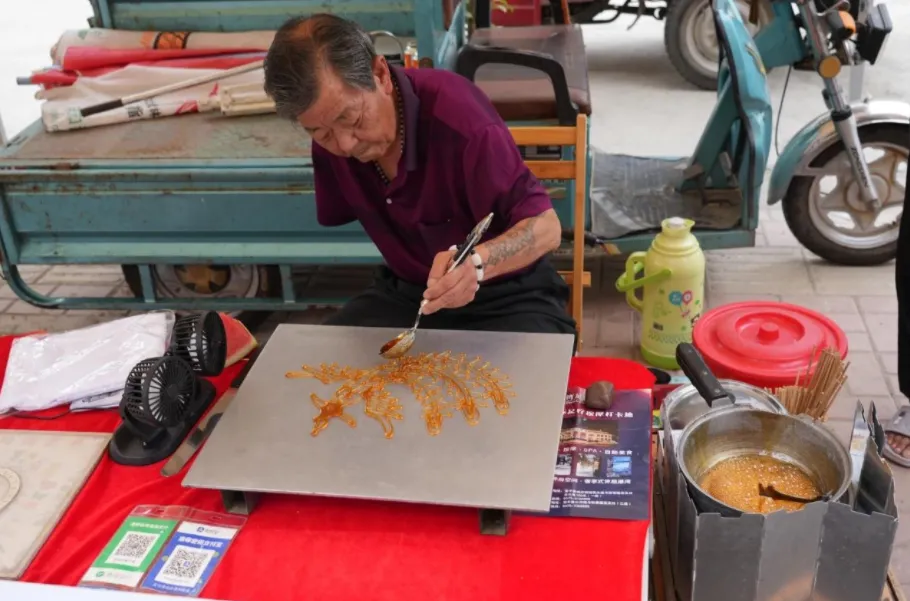 糖畫藝人張全獻當(dāng)天早上6點30分就趕到了這里,是最早來到現(xiàn)場的傳承人。鳳凰、奔馬、玉兔······栩栩如生的“動物”糖畫吸引著孩子們。“糖畫可吃可觀賞,糖畫技藝是古老的非物質(zhì)文化遺產(chǎn),作為糖畫藝人,在文化和自然遺產(chǎn)日參加非遺大集,倍感榮幸。”張全獻說。