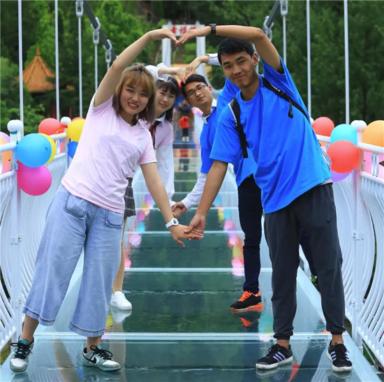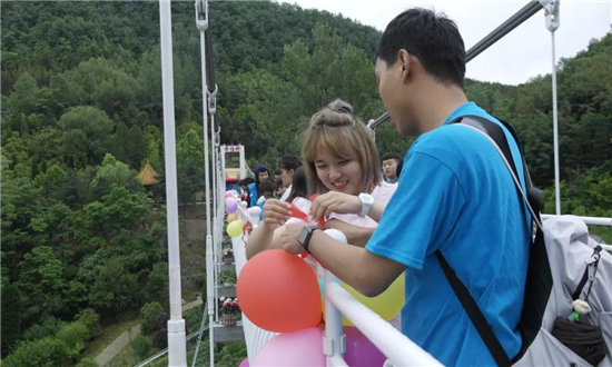 活動(dòng)現(xiàn)場,百余名青年男女在玻璃橋上,拿上代表自己感情的愛情紅絲帶,然后用紅絲帶在玻璃橋上纏繞打結(jié),讓先人見證自己對真摯愛情的期盼。在歡快悠揚(yáng)的樂曲聲中,共同朗誦《關(guān)雎》中的愛情詩篇,期望早日尋找到屬于自己的愛情。此外,在景區(qū)內(nèi)的一吻千年處,二十余對情侶留下了最有特色的一吻,最具人氣的一吻,最優(yōu)雅的一吻。