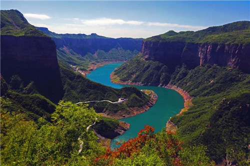 空山新雨后,薄紗舞輕嫣,金秋的寶泉,紅崖連彩云呈豐收喜悅,紫氣環(huán)青山現(xiàn)世間桃源。
