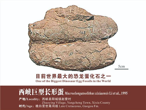據(jù)相關(guān)調(diào)查研究,西峽恐龍蛋化石群賦存層位屬于上白堊統(tǒng)(在西峽盆地自下而上劃分為高溝組、馬家村組和寺溝組),時(shí)代限于晚白堊世,距今9300~7400萬年;高溝組中一般含恐龍蛋8~10層,馬家村組中有7~8層,寺溝組中有1~3層,共計(jì)16~20個(gè)含蛋層。與國內(nèi)外其它發(fā)現(xiàn)恐龍蛋化石的地方相比較,西峽恐龍蛋化石群賦存的層位多且埋藏比較集中,多成窩分布,窩窩相連、距離不遠(yuǎn);甚至還出現(xiàn),不同種類的蛋化石賦存在同一層位,在同一埋藏地點(diǎn)出現(xiàn)十余種類型的蛋化石,前所未有。