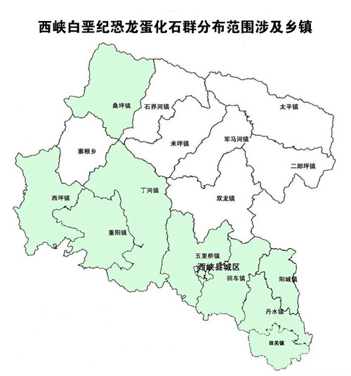 西峽恐龍蛋化石群分布范圍廣、賦存面積大,主要分布在賦存白堊紀(jì)地層的西峽盆地和桑坪盆地內(nèi),分布面積超過500平方千米,占西峽縣國土面積3454平方千米的1/7多,涉及西峽縣的陽城鎮(zhèn)、丹水鎮(zhèn)、回車鎮(zhèn)、田關(guān)鎮(zhèn)、五里橋鎮(zhèn)、重陽鎮(zhèn)、丁河鎮(zhèn)、西坪鎮(zhèn)、桑坪鎮(zhèn)等9個(gè)鎮(zhèn)和三里廟村、趙營村等41個(gè)行政村。