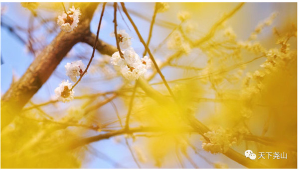 遠(yuǎn)望去,朵朵嫩黃成簇成片,重重疊疊,閃著金黃色的光芒,為堯山早春花事增光添彩。