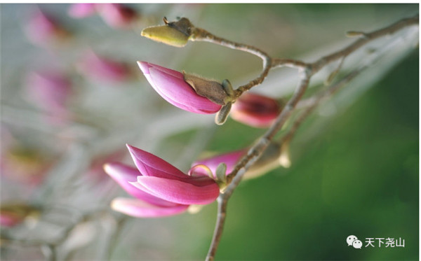 芙蓉發(fā)紅萼,紛紛開自落。高大挺拔的辛夷花則有翩若驚鴻的嬌艷,粉紅的花朵就像落在山澗的一抹霞彩,驚艷人們的雙眸。
