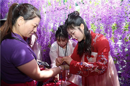 端午節(jié)當天,老君山中天門的紫云漫長廊內(nèi),工作人員擺起了長長的桌子,邀請游客免費體驗點雄黃、戴花繩兒、品嘗充滿本地特色的粽子——槲包。與游客共度佳節(jié),品味濃濃的豫西風情。
