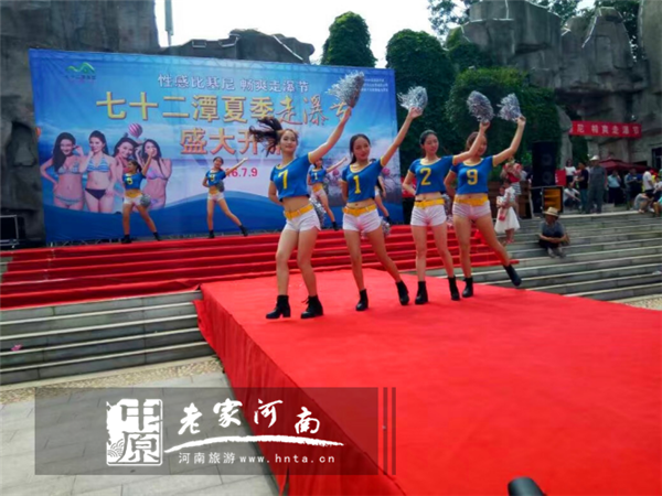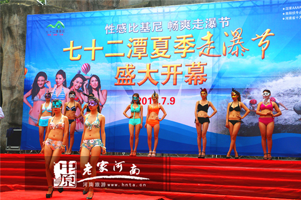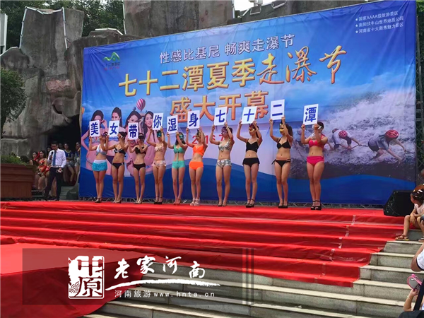 氣勢磅礴的美少女水鼓舞表演拉開了72潭景區(qū)夏季走瀑節(jié)的帷幕!激昂的樂曲,鼓動的節(jié)奏,激情四濺的水花,優(yōu)美的舞姿,燦爛振奮的舞風和鼓韻,給觀眾目不暇接的視覺沖擊和審美享受!開幕式精彩節(jié)目一個接一個,10名性感的 比基尼美女壓軸出場,一亮相就引來眾人歡呼,吸睛度爆棚!瞬間點燃了現場氣氛,舞臺四周圍滿了鼓掌尖叫的游客!