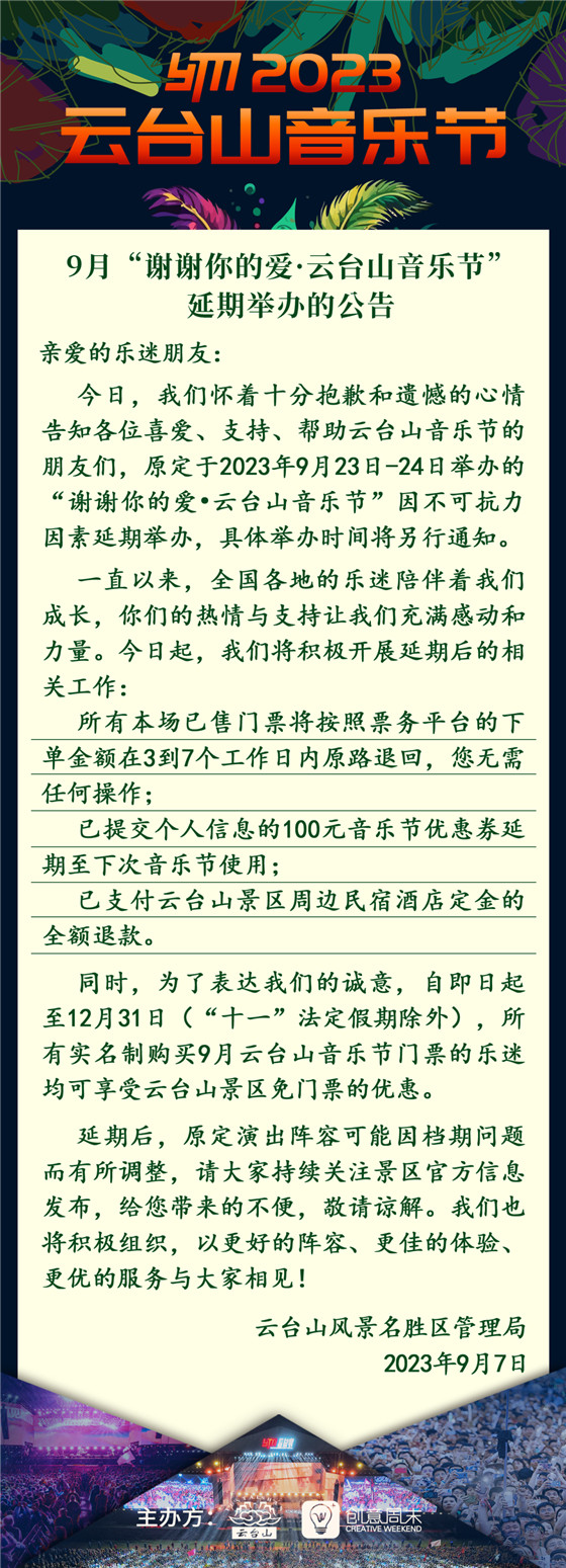 【通知】9月“謝謝你的愛·云臺(tái)山音樂節(jié)”將延期舉辦