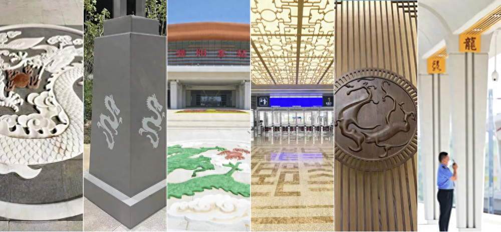 “中華第一龍”在濮陽被發(fā)現(xiàn),濮陽東站以“龍”文化為魂,從遠處看主建筑好似巨龍騰飛,地雕上龍形各異,站內(nèi)龍元素裝飾處處可見,盡顯“龍”文化的深邃。
