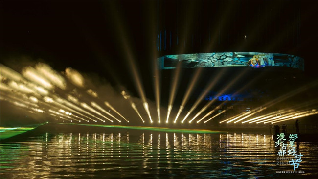 隨著游船行進(jìn),寬廣水面上全長500米的水幕投影矩陣騰空而起,一幅幅卷軸徐徐展開,二七塔、大玉米、中原福塔等地標(biāo)建筑,千里江山圖、詩詞歌賦等山水長卷一一呈現(xiàn)。