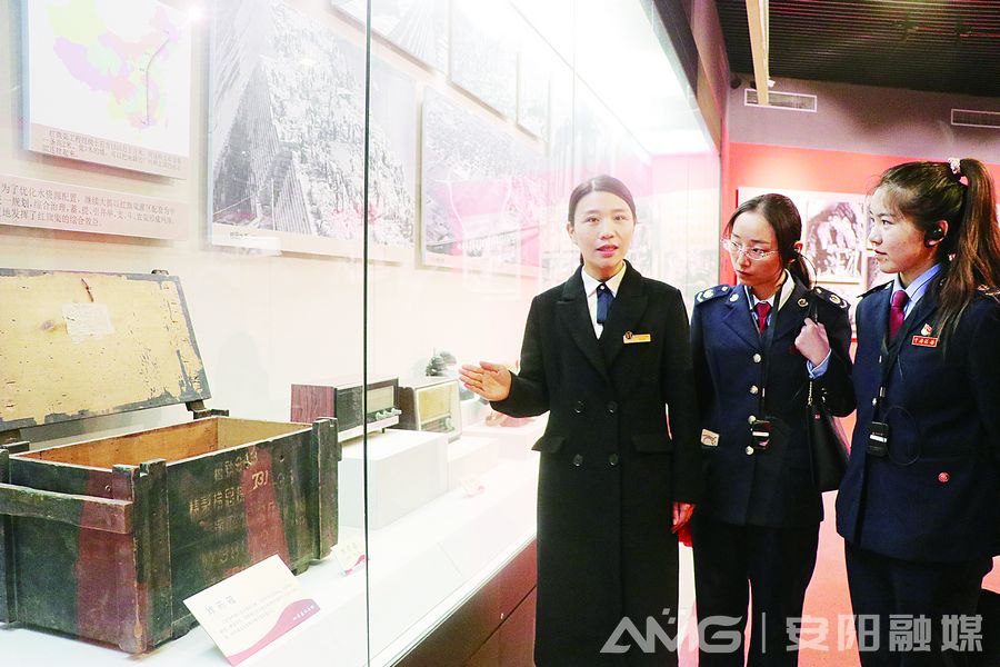 講解員鄭云麗(左一)向參觀者講述廢炸藥箱的故事