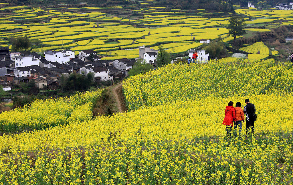 江嶺:中國四大油菜花海之一,十萬畝梯田油菜花海、云海霧海、徽州人家、潔白梨花、粉紅桃花的相融合,隨手一拍都是好照片。這里的萬畝梯田油菜花海,綿延起伏且與村落人家相映相融。金黃色在山谷中奔瀉,農(nóng)人在花海里耕耘。田埂上,花叢中,那一座座用稻草做成的塑像,憨態(tài)可掬,趣味無窮。(春天游婺源不到江嶺,枉來一次旅行)