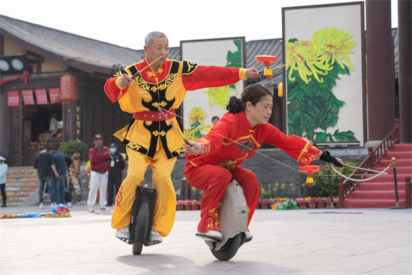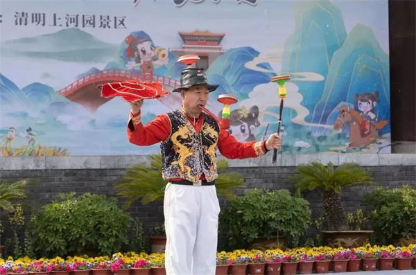 “舞動(dòng)清明”全國(guó)抖空竹展演是清明上河園隆重打造的重頭戲。抖空竹亦稱(chēng)“抖嗡”“抖地鈴”“扯鈴”,是傳統(tǒng)的漢族民間游藝活動(dòng),通過(guò)繩索翻花,做出“過(guò)橋”“對(duì)扔”“串繞”“搶高”等動(dòng)作,具有較強(qiáng)的觀賞性。