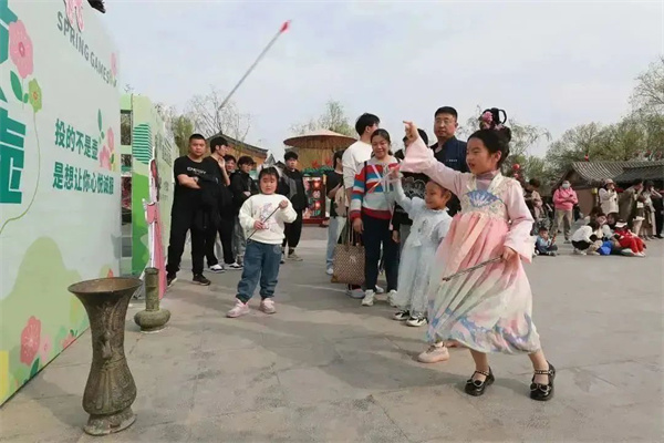 一年之計(jì)在于春。本屆清明文化節(jié)期間,清明上河園推出“游藝清明·宋‘潮’春日運(yùn)動(dòng)會(huì)”,結(jié)合大宋傳統(tǒng)運(yùn)動(dòng)項(xiàng)目,在清明文化廣場(chǎng)抖空竹演出場(chǎng)地周?chē)贾猛秹、陀螺、捶丸等互?dòng)裝置,讓游客在觀看抖空竹演出之余,還能參加一場(chǎng)春天里的“運(yùn)動(dòng)會(huì)”。