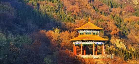 紅葉襯托下的涼亭盡顯冬韻 馬超 攝