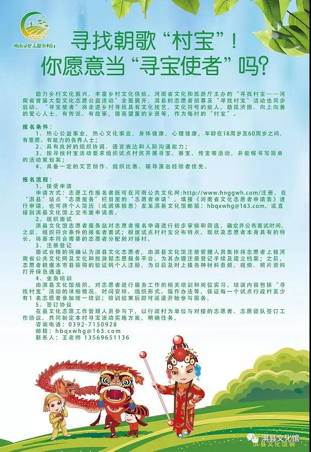 助力鄉(xiāng)村文化振興,豐富鄉(xiāng)村文化產(chǎn)品供給。河南省文化和旅游廳主辦的“尋找村寶——河南省首屆大型文化志愿公益活動(dòng)”全面展開(kāi),淇縣的志愿者招募及“尋找村寶”活動(dòng)也同步啟動(dòng)。“尋找村寶——河南省首屆大型文化志愿公益活動(dòng)”是進(jìn)一步完善我省現(xiàn)代公共文化服務(wù)體系、探索公共文化服務(wù)社會(huì)化的有益嘗試,是實(shí)現(xiàn)向基層“送文化”到“種文化”的有益探索。